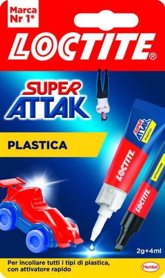 ADESIVO PER PLASTICA ATTAK PLASTIX ADESIVO ISTANTANEO PER PLASTICA CON INNOVATIVO SISTEMA DUO; BASTA STENDERE CON L' APPOSITO PENNELLINO L 'ATTIVATORE E SUBITO DOPO APPLICARE UNA GOCCIA DI ATTAK PLASTIX IN TUBETTO GARANTISCE IN POCHI SECONDI UN INCOLLAG