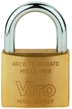 LUCCHETTO RETTANGOLARE VIRO ARCO STANDARD CORPO: OTTONE MASSICCIO, SATINATO E PROTETTO DA VERNICE TRASPARENTE. SPIGOLI SMUSSATI ARCO: ACCIAIO CEMENTATO E TEMPRATO PER UNA ALTA RESISTENZA AL TAGLIO CHIAVI: IN OTTONE NICHELATO, 2 IN DOTAZIONE SCROCC