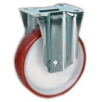 RUOTA IN POLURETANO INIETTATO, NUCLEO IN POLIMMIDE 6, SUPPORTO FISSO NL IL MOZZO CON FORO LISCIO E' REALIZZATO NELLO STESSO MATERIALE DEL NUCLEO E ACCOGLIE DIRETTAMENTE L' ASSALE ASSALE COSTITUITO DA TUBETTO IN ACCIAIO RETTIFICATO, VITE A NORMA UNI EN 240