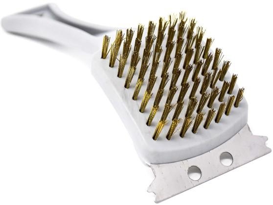 Spazzola abrasiva con setole in ottone e raschietto. Ideale per pulire barbeque e griglie. Rimuove sporco e residui di cibo da griglie e pietre. Facilmente lavabile. Materiali: setole in ottone / plastica / metallo